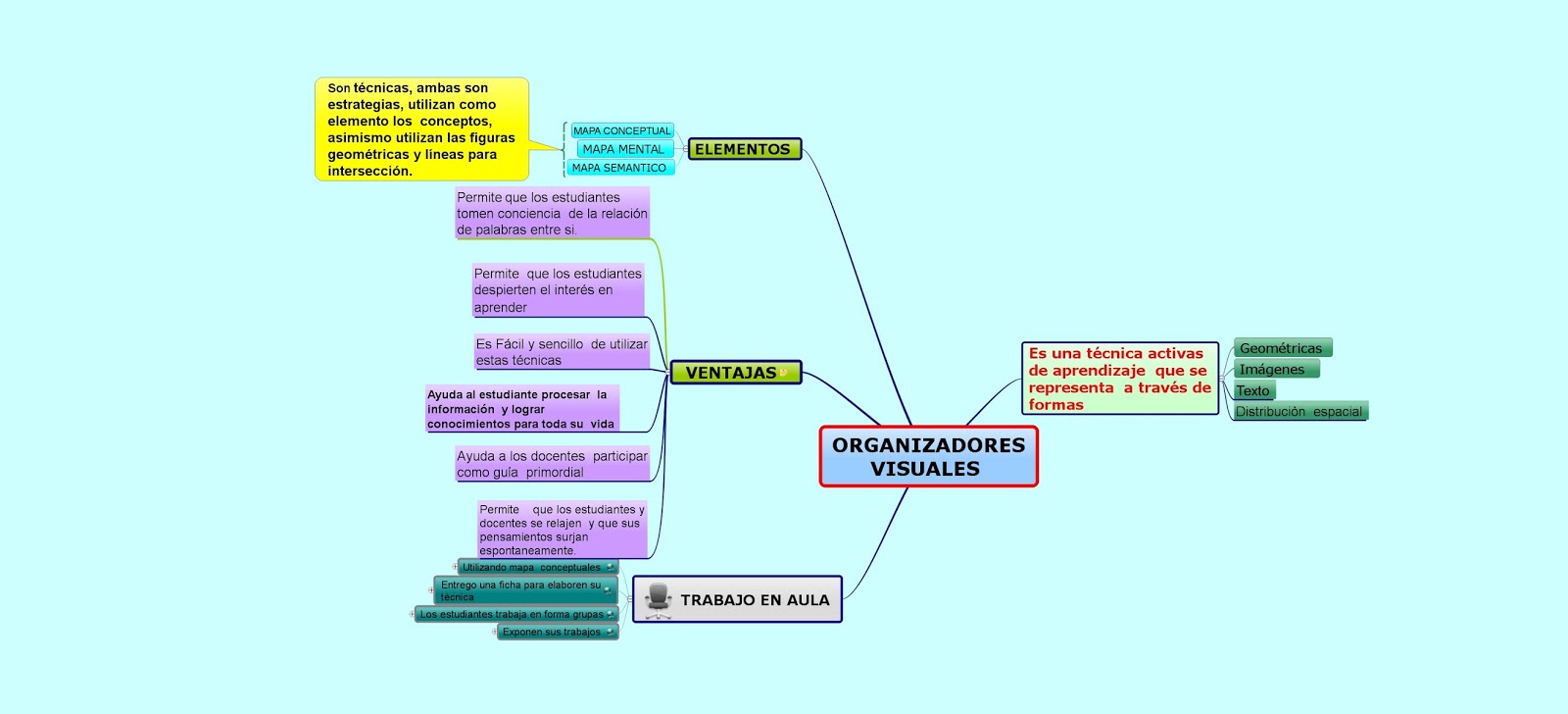 Los organizadores visuales como el mapa semántico va permite activar los conocimientos previos de mis estudiantes al elaboras una clase, que ayuda a las asociaciones utilizando vocabulario.